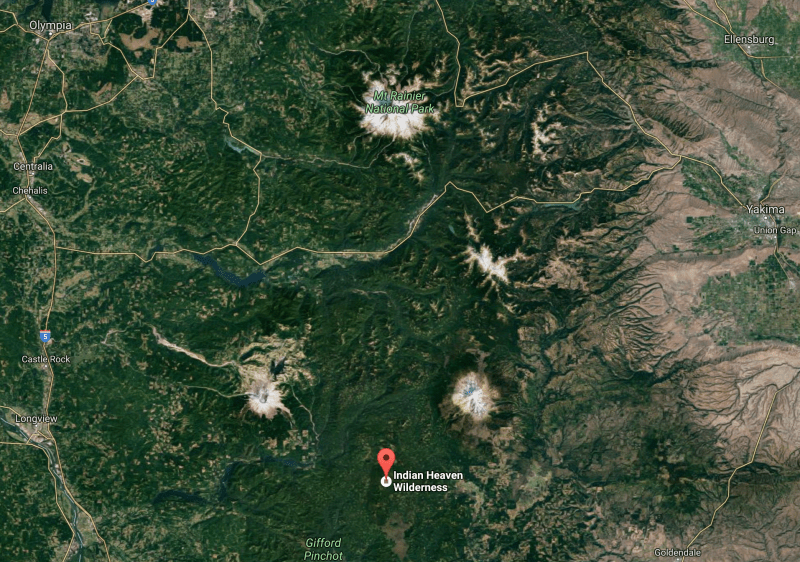 On the left, you have Mount Rainier, on the right, Mountain Adams, and in the foreground, Mount St.-Helens. The tiny white line you see in the center is the Goat Rocks Wilderness. The Indian Heaven Wilderness would be on the extreme right of the image. A little map courtesy of Google illustrates its location well: