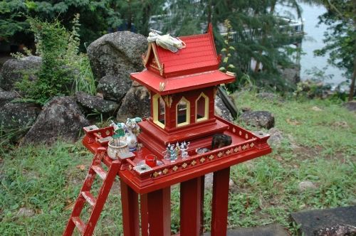 Generally, Thai houses have a “spirit house” which is built closely to the actual house, and is fairly similar in buildup. These are always built outside of the shadow of the main building, and harbor the wandering guardian spirits. On a daily basis, inhabitants of the main house place flowers, food and incense to make sure the spirits look upon the residents positively.