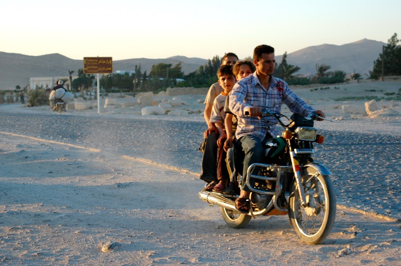 A local family driving from the ruins back to the local town of Tadmur on their motorcycle.