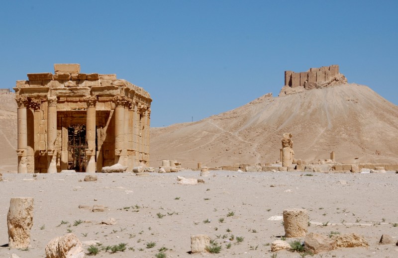The Temple of Baalshamin, in the foreground, which was dedicated to the sky deity Baalshamin. The building was originally built in the 2nd century BC, but rebuilt in 131 AD. This was one of the most complete structures in all of Palmyra, until it was demolished by ISIS in 2015. In the background is the Arab Citadel, also known as Fakhr-al-Din al-Maani Castle, which was built by the Mamluks in the 13th century. This building is in relative safety, as ISIS announced they would only remove objects of “pagan interest”, whereas the castle has little religious value.